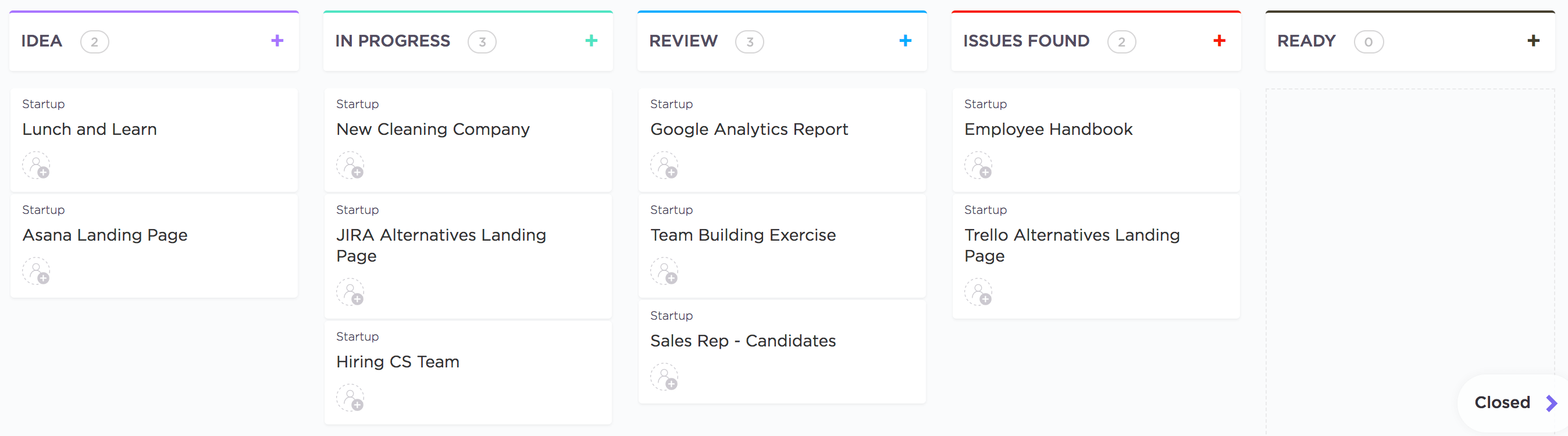 Board View is unique in that it arranges everything by status. When you view Projects or Spaces with different custom statuses, ClickUp automatically sorts and displays all possible columns.