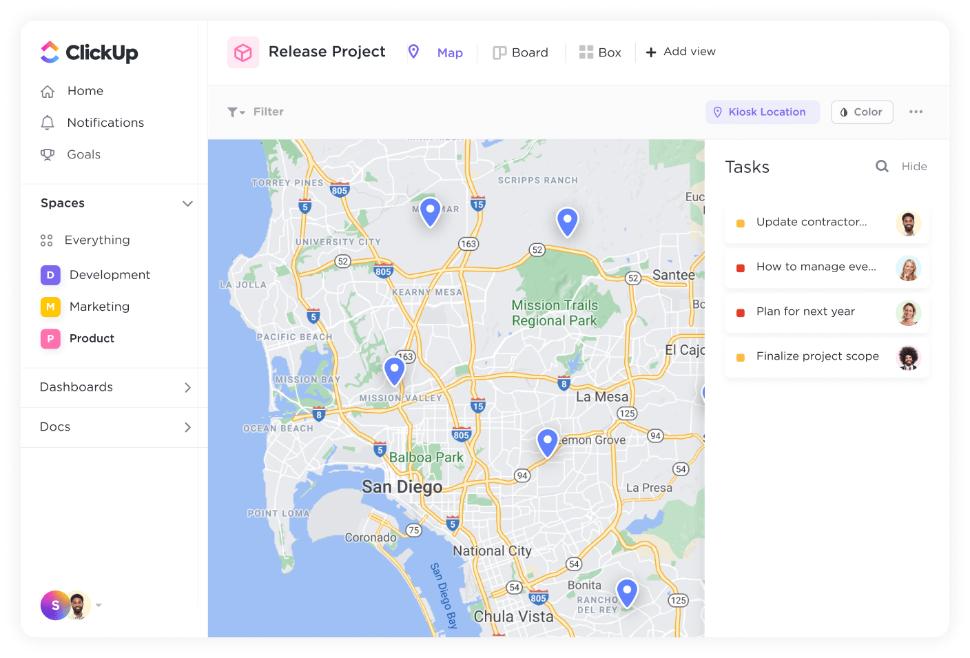 From organizing events to tracking job sites, manage location-specific workflows with ClickUp's Map view.
